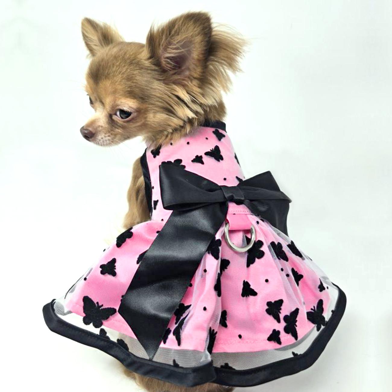 You’ll be all aflutter with this classically elegant harness dress comes in pink with black trim, black bow, and a sweet butterfly overlay. Comes with a solid color satin leash and D-ring (size XL does not have D-ring or leash hole).