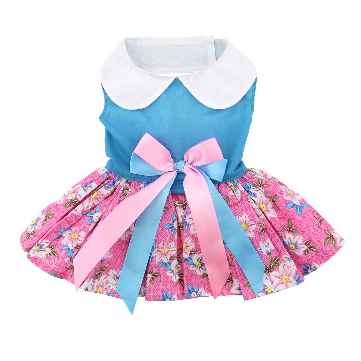 The vivid blue and pink colors in the Plumeria dress bring the season alive! This dress is complete with an adorable pink and blue bow and features our traditional hook and loop closure system on the neck and belly. Includes a matching leash, a sewn in D-ring for easy walking and has heavy duty hook and loop closure for added safety. (Size XL has a leash hole.)